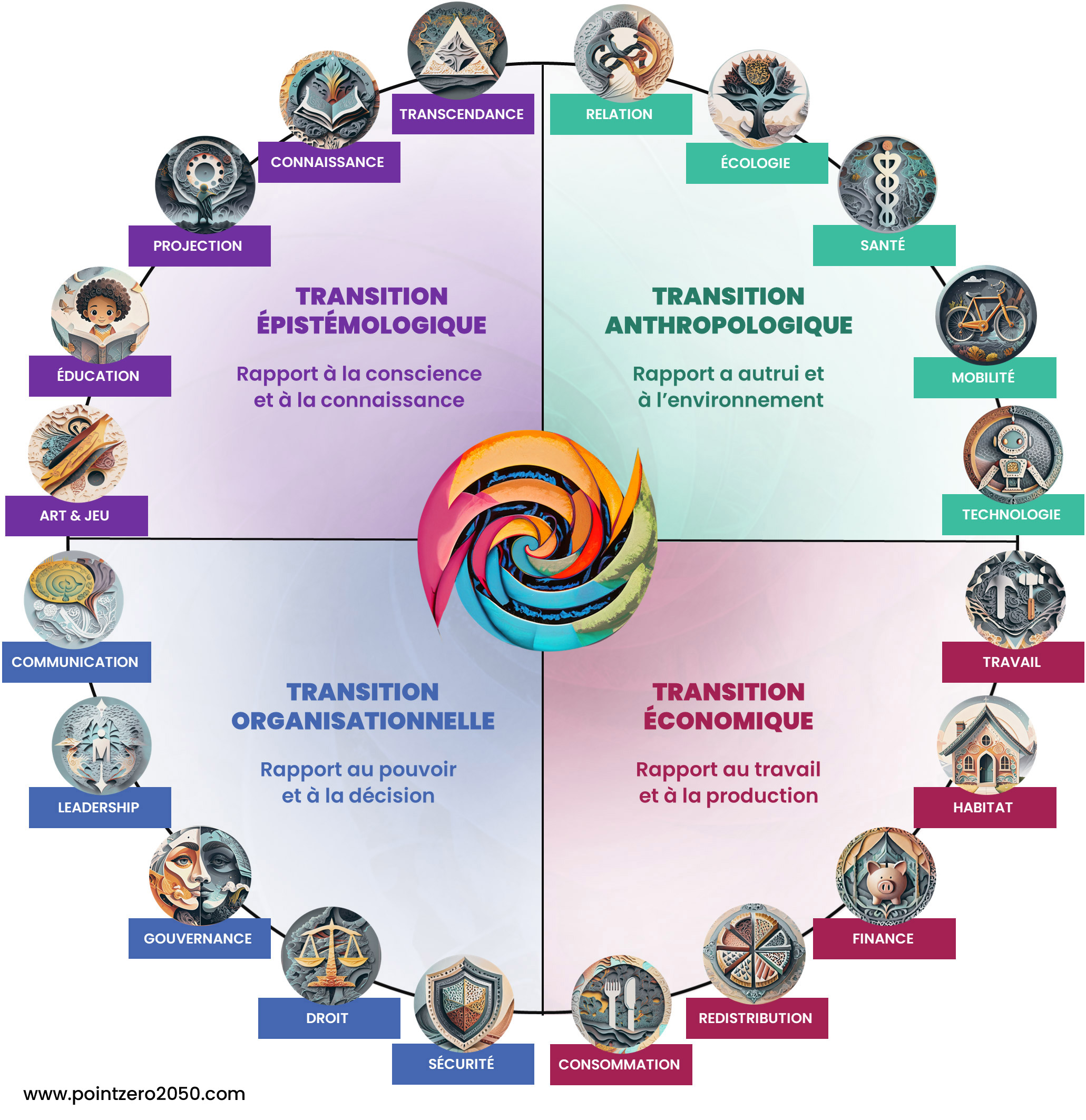 L’écosystème du Point Zéro n’a pas vocation à créer directement une nouvelle civilisation. Sa raison d’être est de créer le cadre capacitant qui va permettre au reste de l’humanité de le faire. Pour cela, le Point Zéro propose une grille de lecture systémique à travers 20 verticales organisées en 4 transitions fondamentales :
