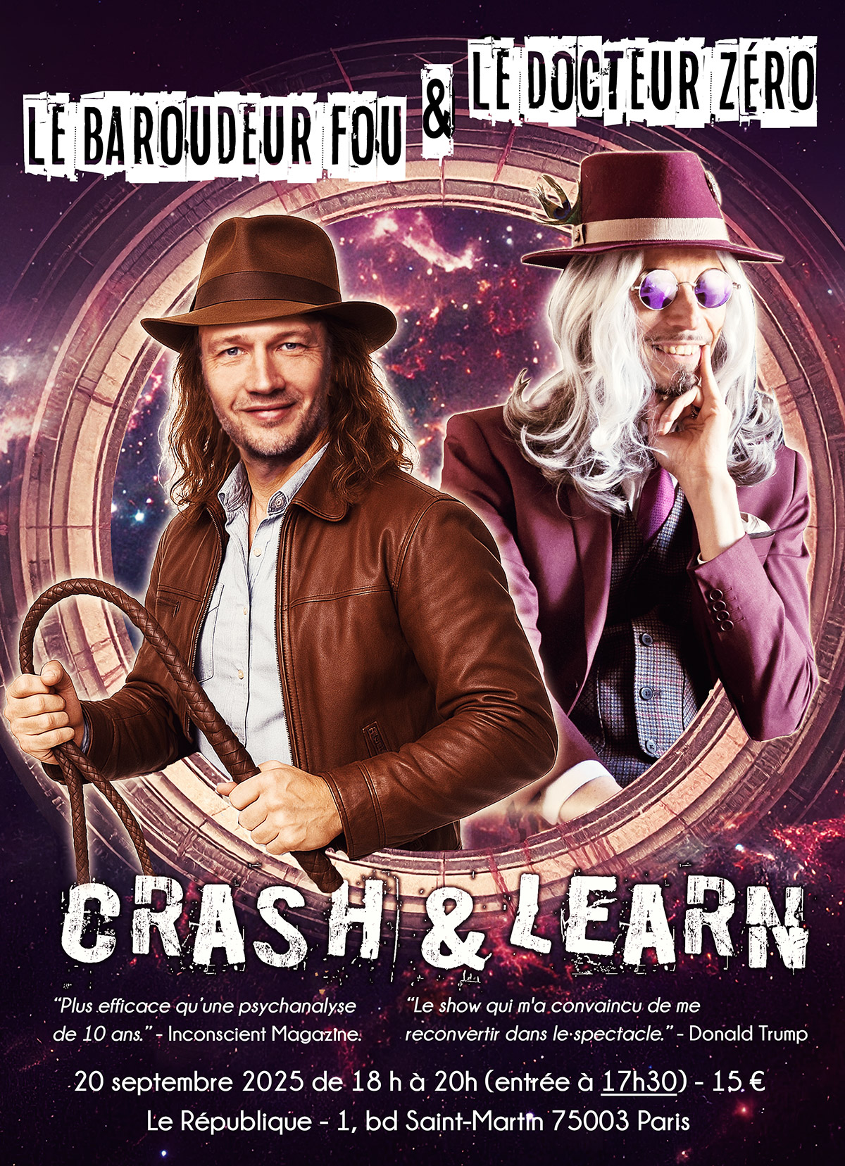 Le Point Zéro ne se vit pas seulement dans les ateliers ou les cercles : il prend aussi corps sur scène. Le 20 septembre 2025, au théâtre Le République à Paris, le Docteur Z.E.R.O. fera sa première apparition publique aux côtés du Baroudeur Fou (Arnaud Collery) dans un spectacle inédit : CRASH & LEARN.